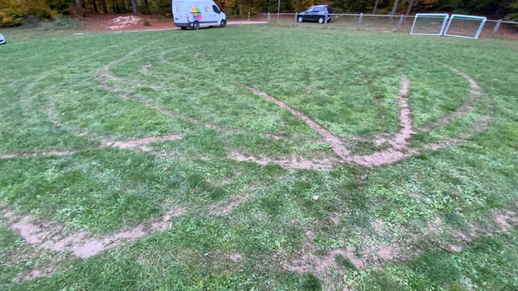 Im Zeitraum zwischen Donnerstag, dem 16., und Sonntag, dem 19. Oktober hinterließ ein Unbekannter mit seinem Fahrzeug tiefe Reifenspuren auf der Spielfläche des Vereins.